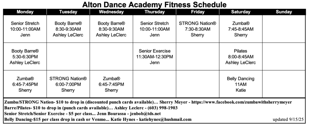 I wish to provide all students with a love and respect for the art of Dance. The Academy currently offers classes in Creative Movement, Pre-Ballet, Ballet, Pointe, Jazz, Modern, Tap, Hip-Hop, Fitness, Contemporary, Character and more! Here at the Alton Dance Academy, I wish to allow your child to explore dance, exercise, and learn specific techniques, in a non- competitive environment. All of our teachers and staff have extensive dance training and/or collegiate degrees in the performance arts. Come dance and join in the fun with The Best of the Lakes Region’s Gold Medal Winner Dance Studio – 4 years in a row!